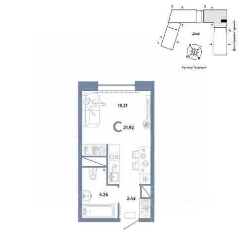 Новая квартира в ЖК "Домашний" напрямую от федеральной группы компаний "Страна Девелопмент". Финансовый партнер — банк "ДОМ.РФ". Продается 1комнатная квартира на 9 этаже от застройщика Страна Девелопмент. Площадь квартиры 21,44 кв. м. ЖК "ДОМАШНИЙ" Жилой комплекс "Домашний" это первый цифровой район в Сибири, где жители заходят в парадные по Face ID, автомобили заезжают в паркинг по сканированию номера, а лифт автоматически спускается на первый этаж при открытии домофона. Даже во дворах — USB-розетки и беседки с подогревом. ПРЕИМУЩЕСТВА -Школа, зеленый сквер и пешеходный бульвар прямо внутри квартала -Закрытые дворы у каждого дома для активного и спокойного отдыха -Охрана, видеонаблюдение 24/7 и доступ к камерам в мобильном приложении -Сквозные парадные с прозрачными входными группами, колясочными и велосипедными -Паркинг с въездом по считыванию номеров, системой контроля выбросов CO2, тележками для покупок и велопарковкой -Торговая галерея на первом этаже дома ОТДЕЛКА Квартиры сдаются с предчистовой отделкой: произведена разводка электричества и отопления, выполнена стяжка пола, стены выровнены "под маяк", установлены розетки, выключатели и радиаторы. ДИЗАЙНЕРСКАЯ ОТДЕЛКА При покупке квартиры в ЖК "Домашний" можно включить стоимость ремонта в ипотеку. Пять вариантов на выбор: Хлопковая нить, Серый шторм, Белый камень, Шалфей, Голубой вереск. СПОСОБЫ ПОКУПКИ Сотрудники "Страна Девелопмент" будут сопровождать вас на каждом этапе сделки, помогут получить одобрение по ипотеке или снизить ежемесячный платеж. - ипотека - материнский капитал -100% оплата наличными Продам 1-комнатную квартиру 20 м2 (квадратных метров) в Тюмени.