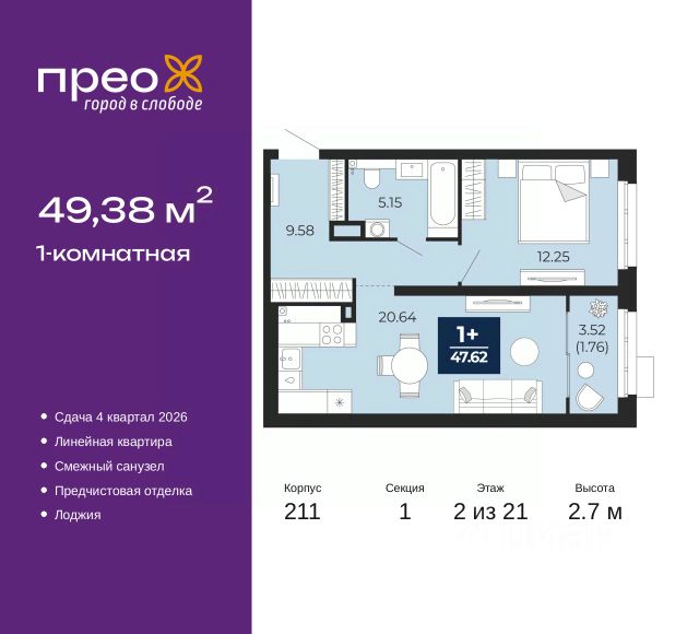 Квартира в счёт первоначального взноса по программе обмена. Информация по телефону, мы вам все подробно расскажем! Просторная однокомнатная квартира с предчистовой отделкой в ЖК "Дом у озера" на 7 этаже. Общая площадь: 51.41 кв.м., жилая: 11.5 кв.м., площадь просторной кухни-гостиной: 17.2 кв.м. Все окна выходят на одну сторону. В квартире одна лоджия, один совмещенный и один раздельный санузел. Высота потолков 2.7 м. Дом монолитный, многоподъездный, переменной этажности, от 1 до 8 этажей. Квартира находится в 7-й секции высотой 8 этажей в корпусе 2. На этаже 4 квартиры. В подъезде 1 пассажирский и 1 грузовой лифт. Окончание строительства - 4 квартал 2025 года. Оформление сделки по договору долевого участия. Квартира с кухней-гостиной и одной спальней в Доме у озера. Особенности планировки: гардеробная, лоджия, мастер-спальня, предчистовая отделка. квартиры в нашей базе: ДМУ-02-7-7.7.3. "Дом у озера" является продолжением "Европейского квартала". Он расположен в центре заречного района города. В 2030 году здесь появится квартал, состоящий из урбан-вилл, таунхаусов, секционных домов и башни. Вокруг уже сформирована необходимая инфраструктура: детские сады, школы, спортивный комплекс, продуктовые магазины, аптеки, кофейни, рестораны и салоны красоты. Путь до центра города занимает 7 минут на машине. Озеро Тихое — ценный рекреационный ресурс. Брусника вернула ему прежнее значение и сделала новой точкой притяжения для жителей микрорайона. Ключевым элементом концепции благоустройства стала вода. В каждой части квартала архитекторы нашли для нее свою форму. Вдоль пешеходных улиц разместили искусственные ручьи, на центральной площади — фонтан и дождевые сады. Основная точка притяжения жителей — озеро и выходящий на его сторону променад. Здесь мы организуем смотровые площадки и расположим летние террасы кафе и ресторанов. Тесную связь застройки с ландшафтом обеспечивает многоуровневое озеленение. Буфер из деревьев и кустарников по периметру квартала превращается в естественный ветрозащитный экран. Такое решение позволяет создать на территории "Дома у озера" комфортный микроклимат. Подъезды "Дома у озера" с прозрачными входными группами и большими лифтами. Для мест общего пользования архитекторы разработали новую интерьерную коллекцию, вдохновленную эклектичными восточными мотивами. В отделке сочетаются коричневый, желтый и белый цвета, повторяющие колористические решения фасадов. Декоративные перегородки, установленные в лобби, напоминают машрабию — элемент арабской архитектуры в виде узорной решетки. За счет мягкой мебели, многоуровневого освещения теплых оттенков и предметов декора (например, зеркал и картин) холлы воспринимаются как продолжение квартиры. #zsCsag Купить 1-комнатную квартиру площадью примерно 50 м2 (кв.м.) в Тюмени.