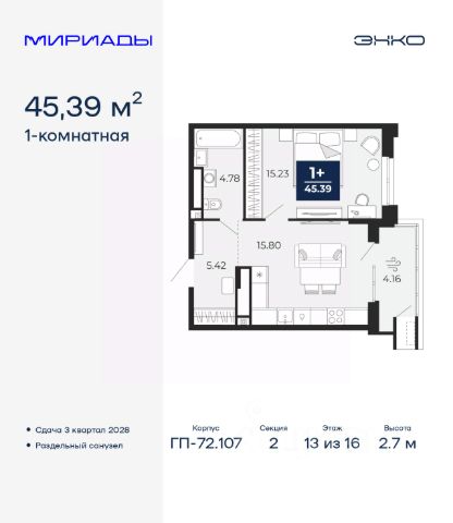 Продается 1-комн. квартира в ЖК "Мириады" на 13 этаже. Общая площадь: 42.26 кв.м. Высота потолков 2.7 м. Дом монолитный, черырехподъездный, переменной этажности, от 13 до 16 этажей. Квартира находится в 3-й секции высотой 14 этажей в корпусе ГП-72.106. На этаже 6 квартир. В подъезде 1 пассажирский и 1 грузовой лифт. Окончание строительства - 3 квартал 2028 года. Оформление сделки по договору долевого участия. Вселенная бесконечных историй. Ранее невиданный Тюмени масштаб: территория 240 гектаров и 1 650 000 м² застройки. Мириады это город масштабных перемен и больших возможностей. Город зеленых рощ и зеркальных озер. Город для работы, учебы и развлечений. Город для детей и их родителей. Город для всех и каждого. Проект расположен в районе Мыс рядом с ТРЦ "Тюмень Сити Молл" в границах улицы Тимофея Чаркова, Тобольского тракта и объездной дороги. Срок полного освоения территории - до 2034 года. #z6deMa