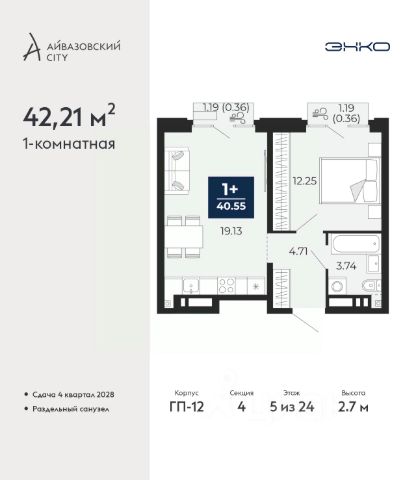 Дом монолитный, многоподъездный, высотой 24 этажа. Квартира находится в 4-й секции в корпусе ГП-12. На этаже 5 квартир. В подъезде 1 пассажирский и 1 грузовой лифт. Окончание строительства - 4 квартал 2028 года. Оформление сделки по договору долевого участия.