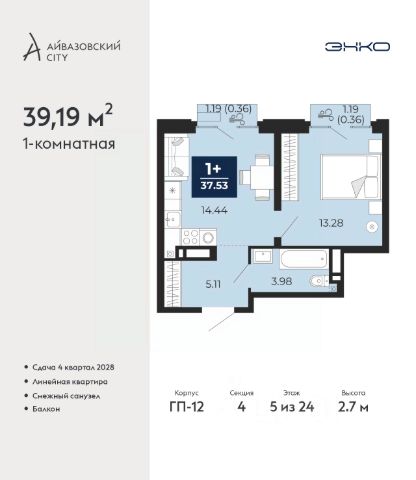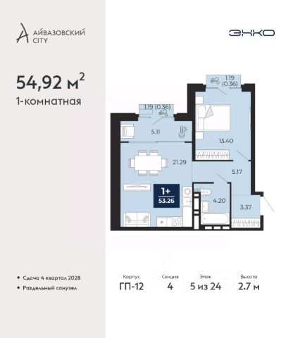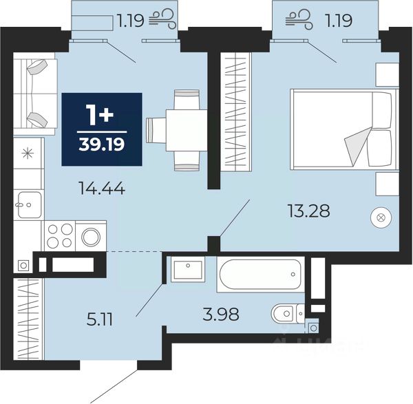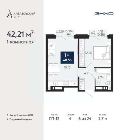Квартира формата 1 + в ЖК Опера рядом с озером Алебашево.