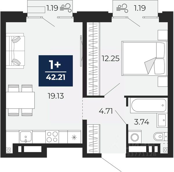 Продается однокомнатная квартира в ЖК "Айвазовский" на 5 этаже. Общая площадь: 39.19 кв.м., жилая: 13.28 кв.м., площадь просторной кухни-столовой: 14.44 кв.м. Все окна выходят на одну сторону. В квартире два балкона, один совмещенный санузел. Высота потолков 2.7 м.