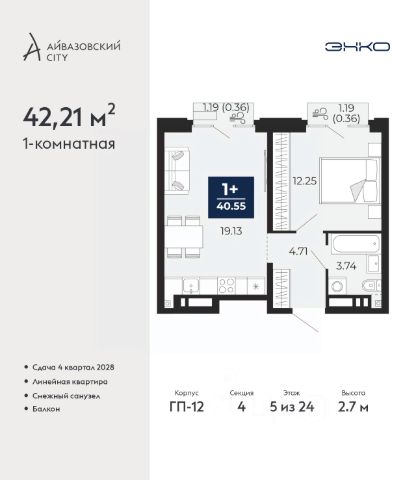 Просторная 1-комн. квартира в ЖК "Айвазовский" на 5 этаже. Общая площадь: 39.19 кв.м., жилая: 13.28 кв.м., площадь просторной кухни-столовой: 14.44 кв.м. Все окна выходят на одну сторону. В квартире два балкона, один совмещенный санузел. Высота потолков 2.7 м.
