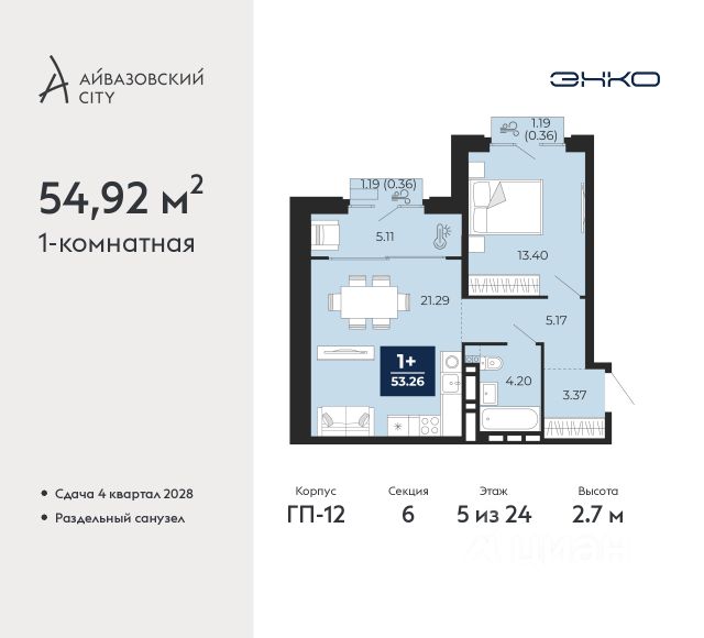 Продается 1-комн. квартира от застройщика в ЖК "Айвазовский" на 5 этаже. Общая площадь: 54.92 кв.м., жилая: 13.4 кв.м., площадь просторной кухни-столовой: 21.29 кв.м. Все окна выходят на одну сторону. В квартире два балкона, один совмещенный санузел. Высота потолков 2.7 м.
