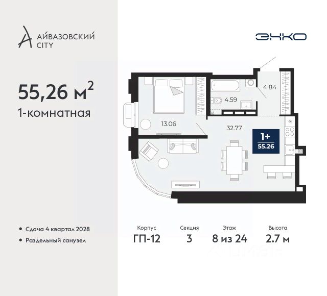 Торопитесь забронировать, пока действует скидка, предложение ограничено! Стоимость квартиры указана со скидкой, ваша экономия составит 500,000 руб. По всем вопросам обращайтесь в офис продаж, мы вам все подробно расскажем. 1-комн. квартира в ЖК "Айвазовский" на 8 этаже. Общая площадь: 55.26 кв.м. Высота потолков 2.7 м. Дом монолитный, многоподъездный, высотой 24 этажа. Квартира находится в 3-й секции в корпусе ГП-12. На этаже 6 квартир. В подъезде 1 пассажирский и 1 грузовой лифт. Окончание строительства - 4 квартал 2028 года. Оформление сделки по договору долевого участия. Новый жилой район располагается в живописном месте на берегу Туры в центральной части города. Принципиально новое пространство для жизни в центре современного города для тех, чьи мечты сбываются, кто нацелен на постоянный рост, перемены к лучшему для себя и своих близких. Каждая деталь ЖК "Айвазовский" вдохновляет и заряжает на новые свершения: авторская архитектура, сбалансированная продуманная инфраструктура, дизайнерские дворы со спортивными и детскими площадками, парковые зоны с фонтанами, водный канал, украшающий центральный прогулочный маршрут района и многое другое. В 2019 года проект стал лауреатом престижной премии Urban Awards 2019 в номинации "Лучший строящийся региональный жилой комплекс бизнес-класса". Главная особенность Айвазовский - соседство разных архитектурных школ в рамках одного дома. Изысканная классика, выразительная эклектика и оригинальный модерн - жить в одном из таких домов настоящий повод для гордости. Айвазовский это идеальное сочетание комфорта, технологий и развитой инфраструктуры. Вход в подъезд возможен с улицы и со двора. Отправляясь на работу или за покупками, жители могут выйти с внешней стороны дома, а для прогулки с ребенком со стороны двора. Экологически чистые материалы и энергосберегающие технологии, качественное освещение общественных зон, видеонаблюдение по всей территории жилого района (в том числе в подъездах, лифтах и в подземном паркинге), закрытые дворы с доступом только для жителей Айвазовский. Часть домов в Айвазовский будут оснащены подземным паркингом. Востребованный в нашем климатическом поясе формат хранения автомобилей защитит собственность владельца в любое время года. Аккредитация в банках: ПАО Банк "ВТБ", "Сбербанк России", ОАО "Альфа-Банк", ПАО "Газпромбанк", ПАО Банк "ФК Открытие" и других. #2mFfMg