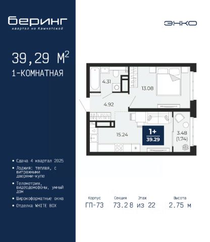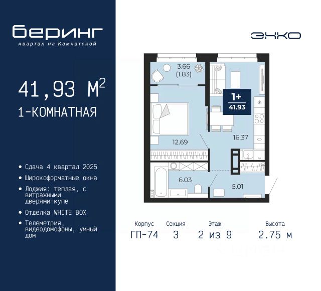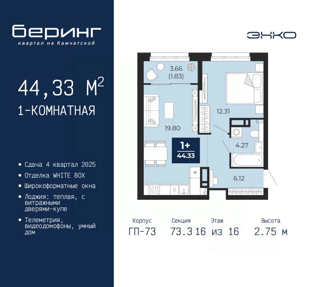 Продается 1-комн. квартира от застройщика в ЖК "Беринг" на 17 этаже. Квартира без отделки, полностью готова к ремонту. Общая площадь: 39.7 кв.м., жилая: 9.55 кв.м., площадь просторной кухни-столовой: 15.29 кв.м. Все окна выходят на одну сторону. В квартире один балкон и одна лоджия, один совмещенный санузел. Высота потолков 2.75 м. Дом монолитный, многоподъездный, переменной этажности, от 9 до 21 этажей. Квартира находится во 2-й секции высотой 17 этажей в корпусе ГП-74. На этаже 7 квартир. В подъезде 1 пассажирский и 1 грузовой лифт. Окончание строительства - 4 квартал 2025 года. Оформление сделки по договору долевого участия. Подобно знаменитому исследователю, мы чувствуем себя первооткрывателями этой локации. Хотим показать новую суть места, сформировать для вас жизненный опыт, которого ещё не было. Беринг — район зелёного цвета. Беринг — район, который откроется вам с другой стороны. Впечатлит новым уровнем комфорта и качеством жизни. Беринг — открытие на карте города. Первый квартал расположен в районе Тура, в границах улиц: Камчатская Западносибирская Энтузиастов. Вокруг уже есть всё для того, чтобы ежедневная рутина была лишь частью жизни и не доставляла дискомфорта. Школы и детские сады, магазины и аптеки, поликлиника, места для семейного отдыха, пеших и велопрогулок, и даже рыбалки. Масштабное озеленение дворов — визитная карточка ЭНКО и ваш оазис спокойствия, чтобы отвлечься от повседневности. Раскидистые деревья, кустарники, травы и цветы — осталось остановиться, вдохнуть и расслабиться, глядя на эту природную красоту. Стилистика подъездов продолжает концепцию Беринга, вдохновлённого Камчаткой: сдержанный, но при этом впечатляющий дизайн соседствует с удобством и функциональностью. #2uS6Uz