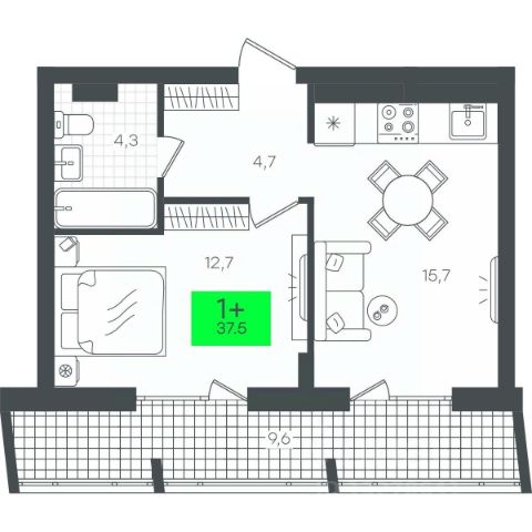 Функциональная планировка каждый метр с пользой. На планировке показан пример размещения мебели: просторная кухня-гостиная и уютная спальня, вместительный коридор, санузел и лоджия. Можно сразу приступать к отделке и создать интерьер под себя без переплаты за чужой вкус.