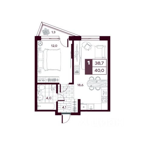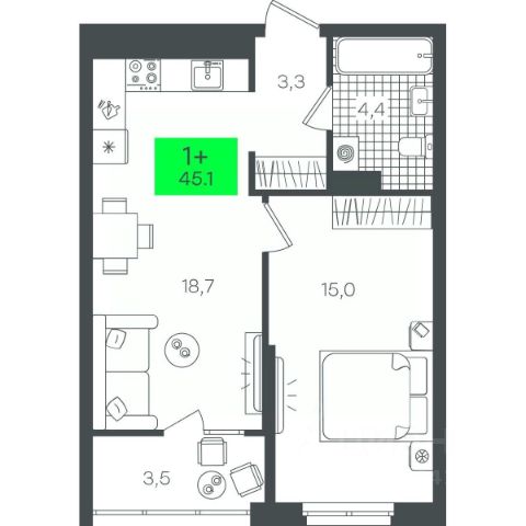 Формат: 1+ (изолированная спальня + просторная кухня-гостиная)