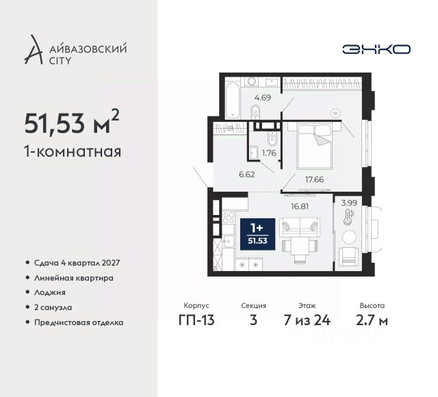 Продаются однокомнатные апартаменты в ЖК "1А Первомайская" на 7 этаже. Апартаменты без отделки, полностью готова к чистовой отделке и дальнейшему ремонту. Общая площадь: 72.3 кв.м., жилая: 19.9 кв.м., площадь просторной кухни-гостиной: 22.4 кв.м. Все окна выходят на одну сторону. В апартаментах одна лоджия, один совмещенный санузел. Высота потолков 2.7 м.
