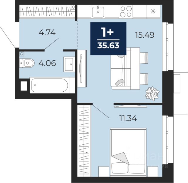 1-комн. квартира с предчистовой отделкой в ЖК "Мотивы" на 14 этаже. Общая площадь: 37.79 кв.м., жилая: 12.44 кв.м., площадь просторной кухни-столовой: 14.71 кв.м. Все окна выходят на одну сторону. В квартире одна лоджия, один совмещенный санузел. Высота потолков 2.7 м.