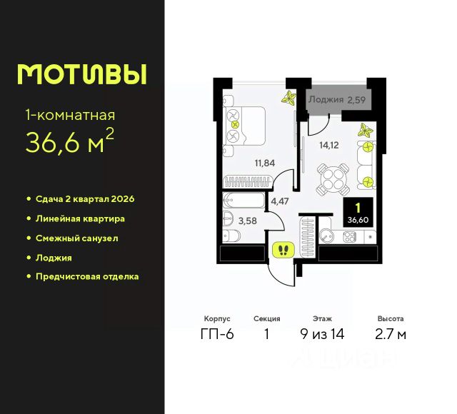 1-комн. квартира с предчистовой отделкой в ЖК "Мотивы" на 9 этаже. Общая площадь: 36.6 кв.м., жилая: 11.84 кв.м., площадь просторной кухни-столовой: 14.12 кв.м. Все окна выходят на одну сторону. В квартире одна лоджия, один совмещенный санузел. Высота потолков 2.7 м.