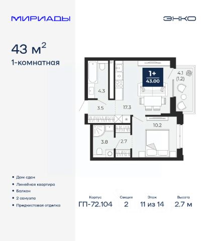 Дом монолитный, двухподъездный, высотой 11 этажей. Апартаменты находятся в 1-й секции в корпусе 2. На этаже 4 квартиры. В подъезде 2 пассажирских лифта. На сегодняшний день строительство окончено, дом сдан во 2 квартале 2021 года. Оформление сделки по договору купли-продажи.