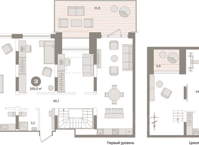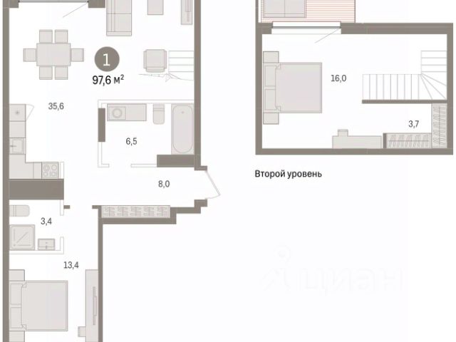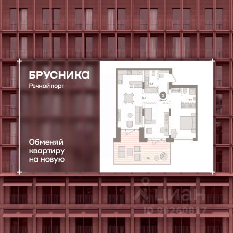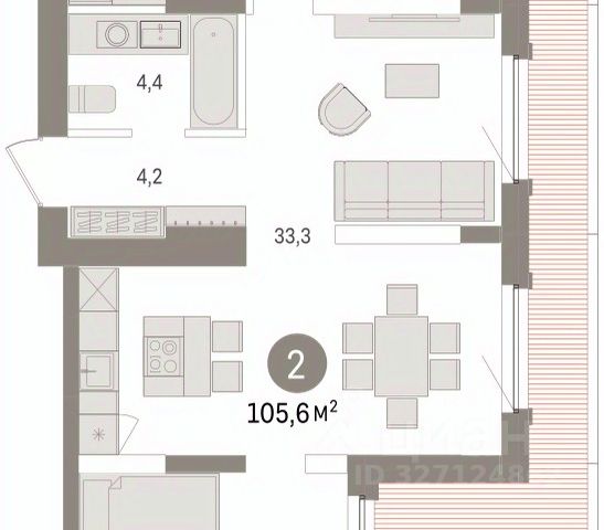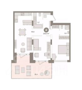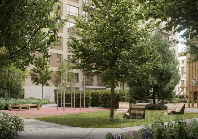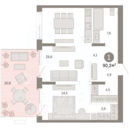 Квартира с кухней-гостиной и одной спальней в кварталах "На Минской". Особенности планировки: вид во двор, гардеробная, окна в пол, панорамное остекление, предчистовая отделка, терраса.