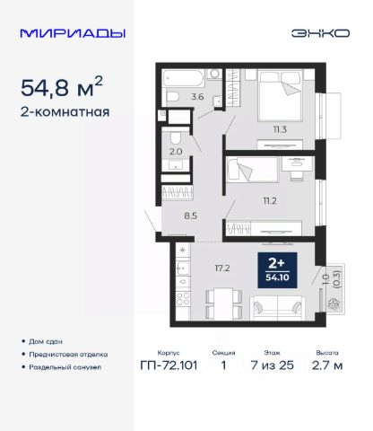 2-комн. квартира с предчистовой отделкой в ЖК "Мириады" на 7 этаже. Общая площадь: 54.8 кв.м. Высота потолков 2.7 м. Квартира находится в корпусе ГП-72.101. Дом монолитный, одноподъездный, высотой 25 этажей. На этаже 8 квартир. В подъезде 2 пассажирских и 1 грузовой лифт. В настоящее время строительство окончено, дом сдан в 4 квартале 2025 года. Оформление сделки по договору купли-продажи. Вселенная бесконечных историй. Ранее невиданный Тюмени масштаб: территория 240 гектаров и 1 650 000 м² застройки. Мириады это город масштабных перемен и больших возможностей. Город зеленых рощ и зеркальных озер. Город для работы, учебы и развлечений. Город для детей и их родителей. Город для всех и каждого. Проект расположен в районе Мыс рядом с ТРЦ "Тюмень Сити Молл" в границах улицы Тимофея Чаркова, Тобольского тракта и объездной дороги. Срок полного освоения территории - до 2034 года. #ZmesfT