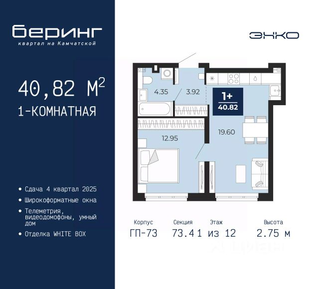 Продается однокомнатная квартира в ЖК "Беринг" на 1 этаже. Квартира без отделки, полностью готова к чистовой отделке и дальнейшему ремонту. Общая площадь: 40.82 кв.м., жилая: 12.95 кв.м., площадь просторной кухни-столовой: 19.6 кв.м. Все окна выходят на одну сторону. В квартире один совмещенный санузел. Высота потолков 2.75 м. Дом монолитный, многоподъездный, переменной этажности, от 9 до 22 этажей. Квартира находится в 73.4-й секции высотой 12 этажей в корпусе ГП-73. На этаже 8 квартир. В подъезде 1 пассажирский и 1 грузовой лифт. Окончание строительства - 4 квартал 2025 года. Оформление сделки по договору долевого участия. Подобно знаменитому исследователю, мы чувствуем себя первооткрывателями этой локации. Хотим показать новую суть места, сформировать для вас жизненный опыт, которого ещё не было. Беринг — район зелёного цвета. Беринг — район, который откроется вам с другой стороны. Впечатлит новым уровнем комфорта и качеством жизни. Беринг — открытие на карте города. Первый квартал расположен в районе Тура, в границах улиц: Камчатская Западносибирская Энтузиастов. Вокруг уже есть всё для того, чтобы ежедневная рутина была лишь частью жизни и не доставляла дискомфорта. Школы и детские сады, магазины и аптеки, поликлиника, места для семейного отдыха, пеших и велопрогулок, и даже рыбалки. Масштабное озеленение дворов — визитная карточка ЭНКО и ваш оазис спокойствия, чтобы отвлечься от повседневности. Раскидистые деревья, кустарники, травы и цветы — осталось остановиться, вдохнуть и расслабиться, глядя на эту природную красоту. Стилистика подъездов продолжает концепцию Беринга, вдохновлённого Камчаткой: сдержанный, но при этом впечатляющий дизайн соседствует с удобством и функциональностью. #zM5FAU