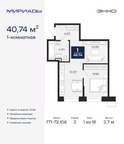 Дом монолитный, многоподъездный, переменной этажности, от 9 до 17 этажей. Квартира находится в 1-й секции высотой 17 этажей в корпусе 1. На этаже 7 квартир. В подъезде 1 пассажирский и 1 грузовой лифт. Начало строительства - 2 квартал 2023 года. Строительство окончено, дом сдан в 4 квартале 2025 года. Оформление сделки по договору купли-продажи.