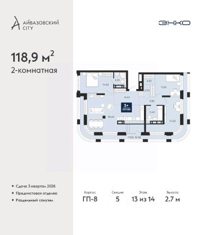 2-комн. квартира от застройщика с предчистовой отделкой в ЖК "Айвазовский" на 13 этаже. Общая площадь: 118.9 кв.м. Высота потолков 2.7 м. Дом монолитный, многоподъездный, переменной этажности, от 14 до 24 этажей. Квартира находится в 5-й секции высотой 14 этажей в корпусе ГП-8. На этаже 5 квартир. В подъезде 1 пассажирский и 1 грузовой лифт. Окончание строительства - 3 квартал 2026 года. Оформление сделки по договору долевого участия. Новый жилой район располагается в живописном месте на берегу Туры в центральной части города. Принципиально новое пространство для жизни в центре современного города для тех, чьи мечты сбываются, кто нацелен на постоянный рост, перемены к лучшему для себя и своих близких. Каждая деталь ЖК "Айвазовский" вдохновляет и заряжает на новые свершения: авторская архитектура, сбалансированная продуманная инфраструктура, дизайнерские дворы со спортивными и детскими площадками, парковые зоны с фонтанами, водный канал, украшающий центральный прогулочный маршрут района и многое другое. В 2019 года проект стал лауреатом престижной премии Urban Awards 2019 в номинации "Лучший строящийся региональный жилой комплекс бизнес-класса". Главная особенность Айвазовский - соседство разных архитектурных школ в рамках одного дома. Изысканная классика, выразительная эклектика и оригинальный модерн - жить в одном из таких домов настоящий повод для гордости. Айвазовский это идеальное сочетание комфорта, технологий и развитой инфраструктуры. Вход в подъезд возможен с улицы и со двора. Отправляясь на работу или за покупками, жители могут выйти с внешней стороны дома, а для прогулки с ребенком со стороны двора. Экологически чистые материалы и энергосберегающие технологии, качественное освещение общественных зон, видеонаблюдение по всей территории жилого района (в том числе в подъездах, лифтах и в подземном паркинге), закрытые дворы с доступом только для жителей Айвазовский. Часть домов в Айвазовский будут оснащены подземным паркингом. Востребованный в нашем климатическом поясе формат хранения автомобилей защитит собственность владельца в любое время года. Аккредитация в банках: ПАО Банк "ВТБ", "Сбербанк России", ПАО "Газпромбанк", ОАО "Альфа-Банк", ПАО "Промсвязьбанк" и других. #2me2Z5