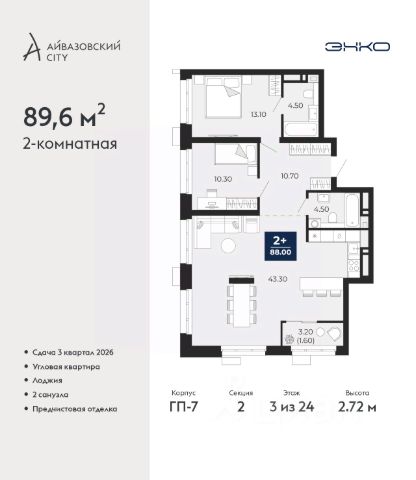 Двухкомнатная квартира с предчистовой отделкой в ЖК "Айвазовский" на 3 этаже. Общая площадь: 89.6 кв.м., жилая: 23.4 кв.м., площадь просторной кухни-столовой: 43.3 кв.м. Угловая квартира, идеально подойдет любителям тишины и панорамных видов. В квартире одна лоджия, два совмещенных санузла. Высота потолков 2.72 м. Дом монолитный, многоподъездный, переменной этажности, от 9 до 24 этажей. Квартира находится во 2-й секции высотой 24 этажа в корпусе ГП-7. На этаже 7 квартир. В подъезде 1 пассажирский и 2 грузовых лифта. Окончание строительства - 3 квартал 2026 года. Оформление сделки по договору долевого участия. Новый жилой район располагается в живописном месте на берегу Туры в центральной части города. Принципиально новое пространство для жизни в центре современного города для тех, чьи мечты сбываются, кто нацелен на постоянный рост, перемены к лучшему для себя и своих близких. Каждая деталь ЖК "Айвазовский" вдохновляет и заряжает на новые свершения: авторская архитектура, сбалансированная продуманная инфраструктура, дизайнерские дворы со спортивными и детскими площадками, парковые зоны с фонтанами, водный канал, украшающий центральный прогулочный маршрут района и многое другое. В 2019 года проект стал лауреатом престижной премии Urban Awards 2019 в номинации "Лучший строящийся региональный жилой комплекс бизнес-класса". Главная особенность Айвазовский - соседство разных архитектурных школ в рамках одного дома. Изысканная классика, выразительная эклектика и оригинальный модерн - жить в одном из таких домов настоящий повод для гордости. Айвазовский это идеальное сочетание комфорта, технологий и развитой инфраструктуры. Вход в подъезд возможен с улицы и со двора. Отправляясь на работу или за покупками, жители могут выйти с внешней стороны дома, а для прогулки с ребенком со стороны двора. Экологически чистые материалы и энергосберегающие технологии, качественное освещение общественных зон, видеонаблюдение по всей территории жилого района (в том числе в подъездах, лифтах и в подземном паркинге), закрытые дворы с доступом только для жителей Айвазовский. Часть домов в Айвазовский будут оснащены подземным паркингом. Востребованный в нашем климатическом поясе формат хранения автомобилей защитит собственность владельца в любое время года. Аккредитация в банках: ПАО Банк "ВТБ", ОАО "Альфа-Банк", "Сбербанк России", ПАО "Газпромбанк", ПАО "Промсвязьбанк" и других. #2MEiEa