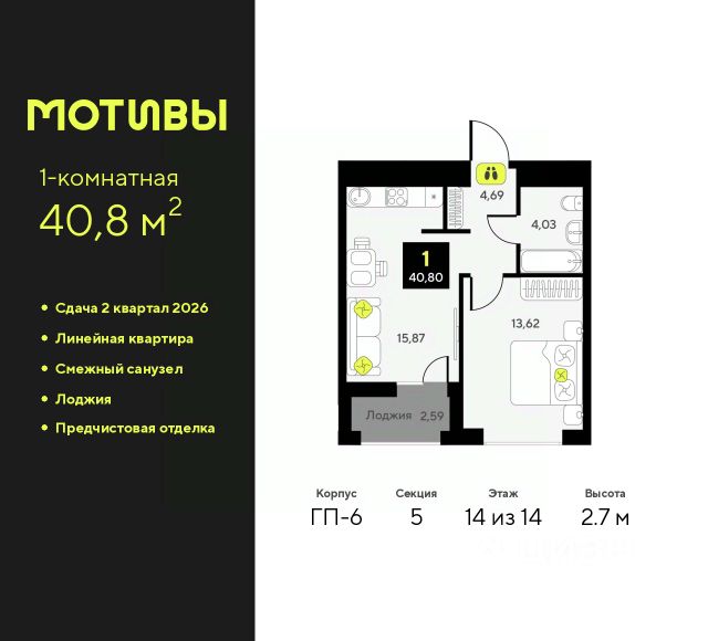 Однокомнатная квартира от застройщика с предчистовой отделкой в ЖК "Мотивы" на 14 этаже. Общая площадь: 38.39 кв.м., жилая: 11.84 кв.м., площадь просторной кухни-столовой: 15.62 кв.м. Все окна выходят на одну сторону. В квартире одна лоджия, один совмещенный санузел. Высота потолков 2.7 м.