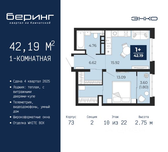 Однокомнатная квартира в ЖК "Беринг" на 10 этаже. Квартира без отделки, после выдачи ключей можно делать ремонт. Общая площадь: 44.48 кв.м., жилая: 12.23 кв.м., площадь просторной кухни-столовой: 19.55 кв.м. Все окна выходят на одну сторону. В квартире одна лоджия, один совмещенный санузел. Высота потолков 2.75 м. Дом монолитный, многоподъездный, переменной этажности, от 9 до 22 этажей. Квартира находится в 73.3-й секции высотой 16 этажей в корпусе ГП-73. На этаже 8 квартир. В подъезде 1 пассажирский и 1 грузовой лифт. Окончание строительства - 4 квартал 2025 года. Оформление сделки по договору долевого участия. Подобно знаменитому исследователю, мы чувствуем себя первооткрывателями этой локации. Хотим показать новую суть места, сформировать для вас жизненный опыт, которого ещё не было. Беринг — район зелёного цвета. Беринг — район, который откроется вам с другой стороны. Впечатлит новым уровнем комфорта и качеством жизни. Беринг — открытие на карте города. Первый квартал расположен в районе Тура, в границах улиц: Камчатская Западносибирская Энтузиастов. Вокруг уже есть всё для того, чтобы ежедневная рутина была лишь частью жизни и не доставляла дискомфорта. Школы и детские сады, магазины и аптеки, поликлиника, места для семейного отдыха, пеших и велопрогулок, и даже рыбалки. Масштабное озеленение дворов — визитная карточка ЭНКО и ваш оазис спокойствия, чтобы отвлечься от повседневности. Раскидистые деревья, кустарники, травы и цветы — осталось остановиться, вдохнуть и расслабиться, глядя на эту природную красоту. Стилистика подъездов продолжает концепцию Беринга, вдохновлённого Камчаткой: сдержанный, но при этом впечатляющий дизайн соседствует с удобством и функциональностью. #ZM5FAI