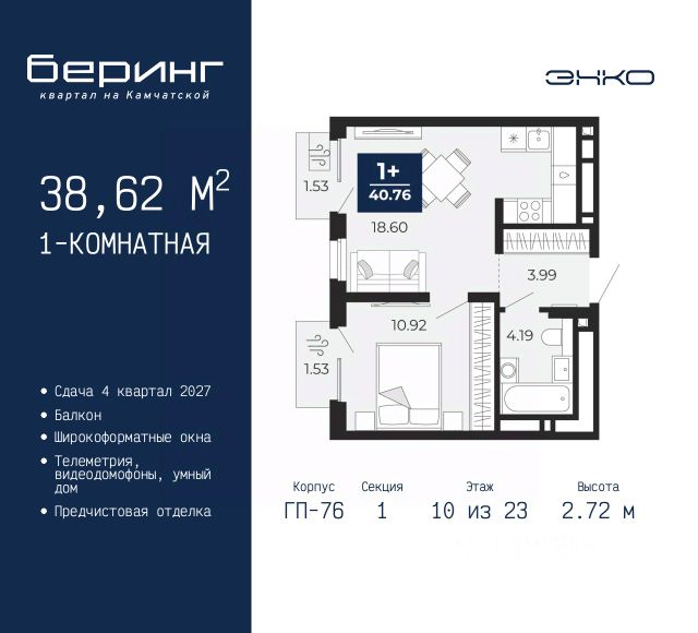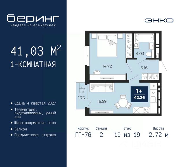 Продается 1-комн. квартира с предчистовой отделкой в ЖК "Беринг" на 10 этаже. Общая площадь: 41.03 кв.м., жилая: 14.72 кв.м., площадь просторной кухни-столовой: 16.59 кв.м. Все окна выходят на одну сторону. В квартире один балкон, один совмещенный санузел. Высота потолков 2.72 м. Дом монолитный, черырехподъездный, переменной этажности, от 19 до 24 этажей. Квартира находится во 2-й секции высотой 19 этажей в корпусе ГП-76. На этаже 8 квартир. В подъезде 1 пассажирский и 1 грузовой лифт. Окончание строительства - 4 квартал 2027 года. Оформление сделки по договору долевого участия. Подобно знаменитому исследователю, мы чувствуем себя первооткрывателями этой локации. Хотим показать новую суть места, сформировать для вас жизненный опыт, которого ещё не было. Беринг — район зелёного цвета. Беринг — район, который откроется вам с другой стороны. Впечатлит новым уровнем комфорта и качеством жизни. Беринг — открытие на карте города. Первый квартал расположен в районе Тура, в границах улиц: Камчатская Западносибирская Энтузиастов. Вокруг уже есть всё для того, чтобы ежедневная рутина была лишь частью жизни и не доставляла дискомфорта. Школы и детские сады, магазины и аптеки, поликлиника, места для семейного отдыха, пеших и велопрогулок, и даже рыбалки. Масштабное озеленение дворов — визитная карточка ЭНКО и ваш оазис спокойствия, чтобы отвлечься от повседневности. Раскидистые деревья, кустарники, травы и цветы — осталось остановиться, вдохнуть и расслабиться, глядя на эту природную красоту. Стилистика подъездов продолжает концепцию Беринга, вдохновлённого Камчаткой: сдержанный, но при этом впечатляющий дизайн соседствует с удобством и функциональностью. #zm6CSD