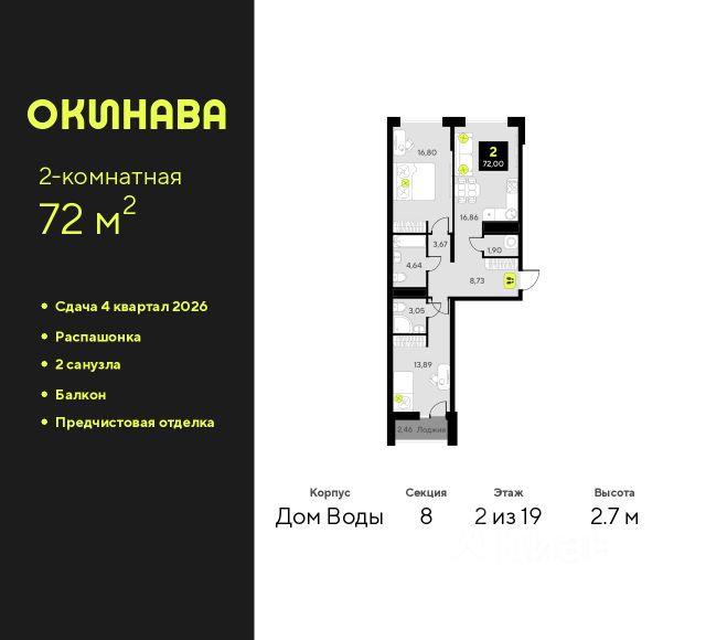 Продается 2-комн. квартира с предчистовой отделкой в ЖК "Окинава" на 2 этаже. Общая площадь: 76.77 кв.м., жилая: 34.2 кв.м., площадь просторной кухни-столовой: 22 кв.м. Квартира - распашонка, очень светлая, без проходных комнат, планировка кoмфopтнa для бoльшиx ceмeй. В квартире одна лоджия, два совмещенных санузла. Высота потолков 2.7 м.