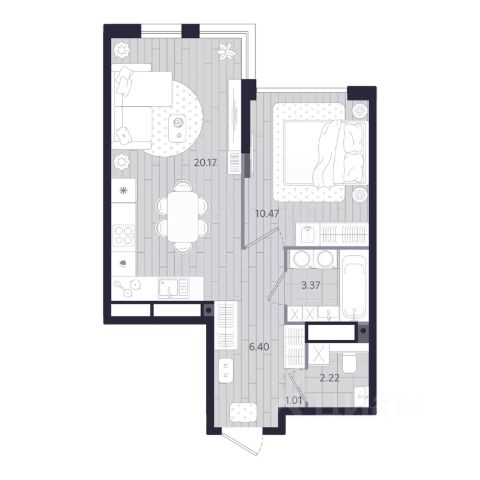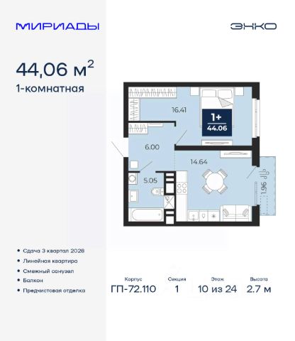 Продается 1-комн. квартира с предчистовой отделкой в ЖК "Республики 205" на 10 этаже. Общая площадь: 42.87 кв.м. Высота потолков 2.7 м.