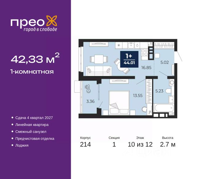 1-комн. квартира от застройщика с предчистовой отделкой в ЖК "Прео" на 10 этаже. Общая площадь: 40.94 кв.м., жилая: 15.08 кв.м., площадь просторной кухни-столовой: 14.08 кв.м. Все окна выходят на одну сторону. В квартире один балкон, один совмещенный санузел. Высота потолков 2.7 м.