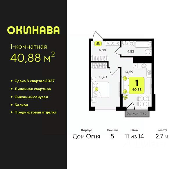 Продается однокомнатная квартира от застройщика с предчистовой отделкой в ЖК "Айвазовский City" на 11 этаже. Общая площадь: 40.14 кв.м., жилая: 14.07 кв.м., площадь просторной кухни-столовой: 15.94 кв.м. Все окна выходят на одну сторону. В квартире один совмещенный санузел. Высота потолков 2.7 м. Дом монолитный, многоподъездный, высотой 24 этажа. Квартира находится в 3-й секции в корпусе ГП-12. На этаже 6 квартир. В подъезде 1 пассажирский и 1 грузовой лифт. Окончание строительства - 4 квартал 2028 года. Оформление сделки по договору долевого участия. Новый жилой район располагается в живописном месте на берегу Туры в центральной части города. Принципиально новое пространство для жизни в центре современного города для тех, чьи мечты сбываются, кто нацелен на постоянный рост, перемены к лучшему для себя и своих близких. Каждая деталь Айвазовский City вдохновляет и заряжает на новые свершения: авторская архитектура, сбалансированная продуманная инфраструктура, дизайнерские дворы со спортивными и детскими площадками, парковые зоны с фонтанами, водный канал, украшающий центральный прогулочный маршрут района и многое другое. В 2019 года проект стал лауреатом престижной премии Urban Awards 2019 в номинации "Лучший строящийся региональный жилой комплекс бизнес-класса". Главная особенность Айвазовский City - соседство разных архитектурных школ в рамках одного дома. Изысканная классика, выразительная эклектика и оригинальный модерн - жить в одном из таких домов настоящий повод для гордости. Айвазовский City это идеальное сочетание комфорта, технологий и развитой инфраструктуры. Вход в подъезд возможен с улицы и со двора. Отправляясь на работу или за покупками, жители могут выйти с внешней стороны дома, а для прогулки с ребенком со стороны двора. Экологически чистые материалы и энергосберегающие технологии, качественное освещение общественных зон, видеонаблюдение по всей территории жилого района (в том числе в подъездах, лифтах и в подземном паркинге), закрытые дворы с доступом только для жителей Айвазовский City. Часть домов в Айвазовский City будут оснащены подземным паркингом. Востребованный в нашем климатическом поясе формат хранения автомобилей защитит собственность владельца в любое время года. Аккредитация в банках: ОАО "Альфа-Банк", ПАО Банк "ВТБ", ПАО "Газпромбанк", "Сбербанк России", ПАО "Промсвязьбанк" и других. #z6Vg59