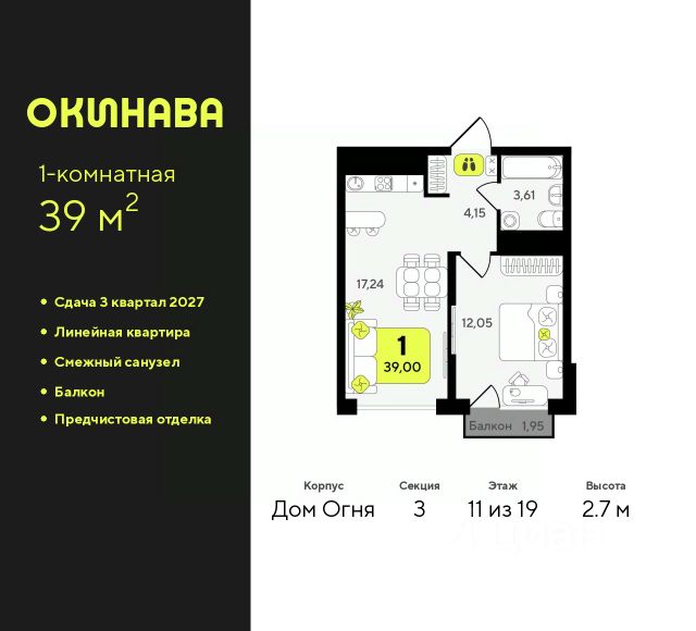Однокомнатная квартира с предчистовой отделкой в ЖК "Айвазовский City" на 11 этаже. Общая площадь: 41.74 кв.м., жилая: 21 кв.м., площадь просторной кухни-столовой: 13.64 кв.м. Все окна выходят на одну сторону. В квартире один совмещенный санузел. Высота потолков 2.7 м. Дом монолитный, многоподъездный, высотой 24 этажа. Квартира находится в 3-й секции в корпусе ГП-12. На этаже 6 квартир. В подъезде 1 пассажирский и 1 грузовой лифт. Окончание строительства - 4 квартал 2028 года. Оформление сделки по договору долевого участия. Новый жилой район располагается в живописном месте на берегу Туры в центральной части города. Принципиально новое пространство для жизни в центре современного города для тех, чьи мечты сбываются, кто нацелен на постоянный рост, перемены к лучшему для себя и своих близких. Каждая деталь Айвазовский City вдохновляет и заряжает на новые свершения: авторская архитектура, сбалансированная продуманная инфраструктура, дизайнерские дворы со спортивными и детскими площадками, парковые зоны с фонтанами, водный канал, украшающий центральный прогулочный маршрут района и многое другое. В 2019 года проект стал лауреатом престижной премии Urban Awards 2019 в номинации "Лучший строящийся региональный жилой комплекс бизнес-класса". Главная особенность Айвазовский City - соседство разных архитектурных школ в рамках одного дома. Изысканная классика, выразительная эклектика и оригинальный модерн - жить в одном из таких домов настоящий повод для гордости. Айвазовский City это идеальное сочетание комфорта, технологий и развитой инфраструктуры. Вход в подъезд возможен с улицы и со двора. Отправляясь на работу или за покупками, жители могут выйти с внешней стороны дома, а для прогулки с ребенком со стороны двора. Экологически чистые материалы и энергосберегающие технологии, качественное освещение общественных зон, видеонаблюдение по всей территории жилого района (в том числе в подъездах, лифтах и в подземном паркинге), закрытые дворы с доступом только для жителей Айвазовский City. Часть домов в Айвазовский City будут оснащены подземным паркингом. Востребованный в нашем климатическом поясе формат хранения автомобилей защитит собственность владельца в любое время года. Аккредитация в банках: ПАО Банк "ВТБ", ПАО "Газпромбанк", ОАО "Альфа-Банк", "Сбербанк России", ПАО Банк "ФК Открытие" и других. #zmVgma