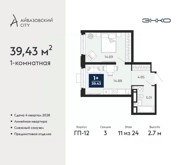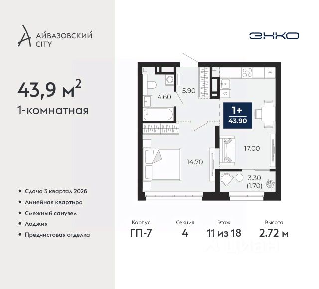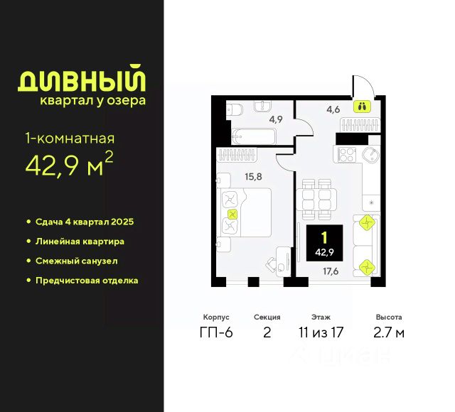 1-комн. квартира с предчистовой отделкой в ЖК "Дивный квартал у озера" на 11 этаже. Общая площадь: 52.4 кв.м., жилая: 17.8 кв.м., площадь просторной кухни-столовой: 15.9 кв.м. Квартира угловая, очень светлая, естественная вентиляция при открытии окон. В квартире один совмещенный санузел. Высота потолков 2.7 м. Квартира будет сдаваться с предчистовой отделкой White Box: выровнены и оштукатурены стены, проведено электричество и отопление, установлены радиаторы. Вы также можете приобрести квартиру с ремонтом от застройщика, представленным в трех цветовых решениях Scandi, Wood и Coffee и включающим: ламинат, обои под покраску, двери, натяжной потолок, санузел с сантехникой. При желании вы можете заказать отделку под ключ, варианты возможных решений представлены в альбоме фотографий. Дом монолитный, черырехподъездный, переменной этажности, от 7 до 23 этажей. Квартира находится в 3-й секции высотой 17 этажей в корпусе ГП-4. На этаже 5 квартир. В подъезде 1 пассажирский и 1 грузовой лифт. Окончание строительства - 4 квартал 2025 года. Оформление сделки по договору долевого участия. "Дивный квартал у озера" современный жилой квартал, удобно расположенный в 10-ти минутах от центра Тюмени, в уютном районе рядом с зеленым массивом и озером Алебашево. Комплекс находится между улицами Мельникайте и Алебашевская, что обеспечивает его хорошую транспортную доступность до центра на автомобиле всего 10 минут. Рядом с комплексом расположен Лесопарк имени Гагарина, экзотический Парк дружбы между Россией и Республикой Корея. "Дивный квартал у озера" объединяет архитектуру современной городской застройки и природную эстетику. Уютные дворы жилого комплекса будут не только безопасными, но и тихими. Закрытая территория надёжно защищена от шума и посторонних глаз. Здесь будут места для отдыха, детские площадки, зоны для выгула собак. В холлах первого этажа расположены мягкая зона ожидания, общественные санузлы и просторная колясочная. Квартал будет располагать богатой инфраструктурой: на первых этажах домов разместятся магазины, пекарни, кофейни, пункты выдачи, аптеки, детские центры, цветочные салоны и многое другое, что сделает жизнь поистине комфортной. В комплексе есть теплый подземный паркинг и кладовые. #z69aaT