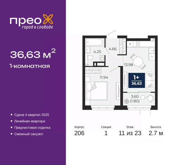 Просторная 1-комн. квартира с предчистовой отделкой в ЖК "Прео" на 11 этаже. Общая площадь: 41.23 кв.м., жилая: 17.67 кв.м., площадь просторной кухни-столовой: 12.3 кв.м. Все окна выходят на одну сторону. В квартире один балкон, один совмещенный санузел. Высота потолков 2.7 м. Дом монолитный, трехподъездный, переменной этажности, от 14 до 22 этажей. Квартира находится во 2-й секции высотой 22 этажа в корпусе 208. На этаже 10 квартир. В подъезде 1 пассажирский и 1 грузовой лифт. Окончание строительства - 4 квартал 2025 года. Оформление сделки по договору долевого участия. Преображенский — один из самых привлекательных районов для жизни! Это полностью самостоятельный жилой район с точки зрения инфраструктуры. Преображенский находится между Московским и Червишевским трактами в квартале улиц Закалужская — Вьюжная — Александра Протозанова. Не нужно ждать, когда появится инфраструктура — переезжайте на всё готовое. Вблизи расположены действующие школа и детский сад. В этом году откроется еще один сад, а в следующем году — школа. По соседству с Преображенским запланировано строительство городского парка "Комарово" площадью 38 гектар. За 10 минут можно доехать на автомобиле до крупных ТРЦ: "Лента", "Кристалл", "Леруа Мерлен", "Метро" и "Ашан". С 2018 года в районе открыт Соседский центр — пространство, созданное для формирования добрососедской среды, совместного досуга, общения и реализации соседских инициатив. Здесь проходят встречи соседей, а также сами жители района организовывают мероприятия. Организатором такого события может стать любой желающий. В квартирах выполнена качественная предчистовая отделка. Гладкие стены с финишным выравниванием по маякам. Ровный потолок для установки натяжного потолка. Установлены пятикамерные окна с двойным стеклопакетом (3 стекла). Дизайнерские холлы с видеонаблюдением, безбарьерным и прозрачным входом всегда светло и спокойно. На первом этаже есть просторные колясочные, где все жители могут оставлять свои коляски и велосипеды. В Преображенском есть всё, что нужно для активного отдыха и занятий спортом. Мы сделали большое футбольное поле с безопасным покрытием. Также установили хоккейный корт, который оборудован по всем необходимым стандартам. Во дворах можно делать упражнения на специальных площадках с турниками. Весь район мы обустроили велодорожками, которые связаны в единый маршрут. У нас есть сухие фонтаны, бьющие из земли, деревья, веревки, сетки, скалодром, газон, песок и резинка — осталось просто дать своему ребенку право на свободную игру. По-настоящему хорошие дворы — это те, которые дети предпочитают соцсетям и телевизору. Аккредитация в банках: ПАО Банк "ВТБ", ПАО "Газпромбанк", ПАО "Банк Уралсиб", ОАО "Альфа-Банк", "Сбербанк России" и других. #Z6vdbE