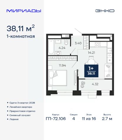 Успейте оформить бронирование по акционной цене, предложение ограничено! Стоимость квартиры указана со скидкой, ваша экономия составит 338,091 руб. По всем вопросам обращайтесь в офис продаж, наши менеджеры вам все расскажут. Просторная однокомнатная квартира с предчистовой отделкой в ЖК "Мириады" на 11 этаже. Общая площадь: 43.8 кв.м. Высота потолков 2.7 м. Дом монолитный, трехподъездный, переменной этажности, от 14 до 16 этажей. Квартира находится во 2-й секции высотой 16 этажей в корпусе ГП-72.103. На этаже 6 квартир. В подъезде 1 пассажирский и 1 грузовой лифт. На сегодняшний день строительство завершено, дом сдан в 4 квартале 2025 года. Оформление сделки по договору купли-продажи. Вселенная бесконечных историй. Ранее невиданный Тюмени масштаб: территория 240 гектаров и 1 650 000 м² застройки. Мириады это город масштабных перемен и больших возможностей. Город зеленых рощ и зеркальных озер. Город для работы, учебы и развлечений. Город для детей и их родителей. Город для всех и каждого. Проект расположен в районе Мыс рядом с ТРЦ "Тюмень Сити Молл" в границах улицы Тимофея Чаркова, Тобольского тракта и объездной дороги. Срок полного освоения территории - до 2034 года. #zMdeC5