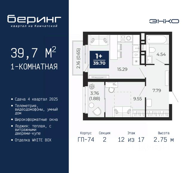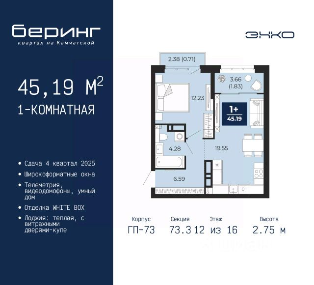 1-комн. квартира от застройщика в ЖК "Беринг" на 12 этаже. Квартира без отделки, после оформления собственности можно делать ремонт. Общая площадь: 32.01 кв.м., жилая: 13.68 кв.м., площадь кухни: 8.85 кв.м. Все окна выходят на одну сторону. В квартире одна лоджия, один совмещенный санузел. Высота потолков 2.75 м. Дом монолитный, многоподъездный, переменной этажности, от 9 до 22 этажей. Квартира находится в 73.4-й секции высотой 12 этажей в корпусе ГП-73. На этаже 8 квартир. В подъезде 1 пассажирский и 1 грузовой лифт. Окончание строительства - 4 квартал 2025 года. Оформление сделки по договору долевого участия. Подобно знаменитому исследователю, мы чувствуем себя первооткрывателями этой локации. Хотим показать новую суть места, сформировать для вас жизненный опыт, которого ещё не было. Беринг — район зелёного цвета. Беринг — район, который откроется вам с другой стороны. Впечатлит новым уровнем комфорта и качеством жизни. Беринг — открытие на карте города. Первый квартал расположен в районе Тура, в границах улиц: Камчатская Западносибирская Энтузиастов. Вокруг уже есть всё для того, чтобы ежедневная рутина была лишь частью жизни и не доставляла дискомфорта. Школы и детские сады, магазины и аптеки, поликлиника, места для семейного отдыха, пеших и велопрогулок, и даже рыбалки. Масштабное озеленение дворов — визитная карточка ЭНКО и ваш оазис спокойствия, чтобы отвлечься от повседневности. Раскидистые деревья, кустарники, травы и цветы — осталось остановиться, вдохнуть и расслабиться, глядя на эту природную красоту. Стилистика подъездов продолжает концепцию Беринга, вдохновлённого Камчаткой: сдержанный, но при этом впечатляющий дизайн соседствует с удобством и функциональностью. #Z6Id3e