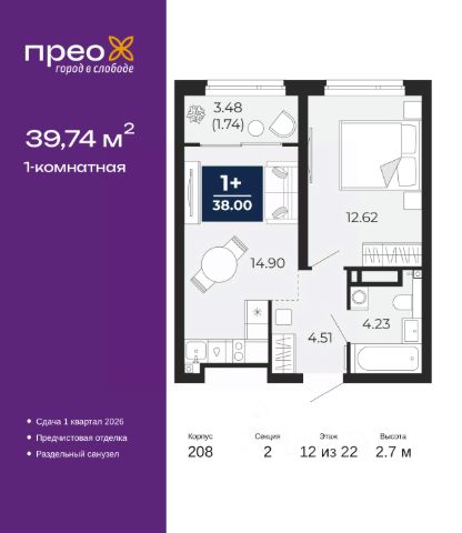 Однокомнатная квартира с предчистовой отделкой в ЖК "Прео" на 12 этаже. Общая площадь: 39.74 кв.м., жилая: 12.62 кв.м., площадь просторной кухни-столовой: 14.9 кв.м. Все окна выходят на одну сторону. В квартире одна лоджия, один совмещенный санузел. Высота потолков 2.7 м.
