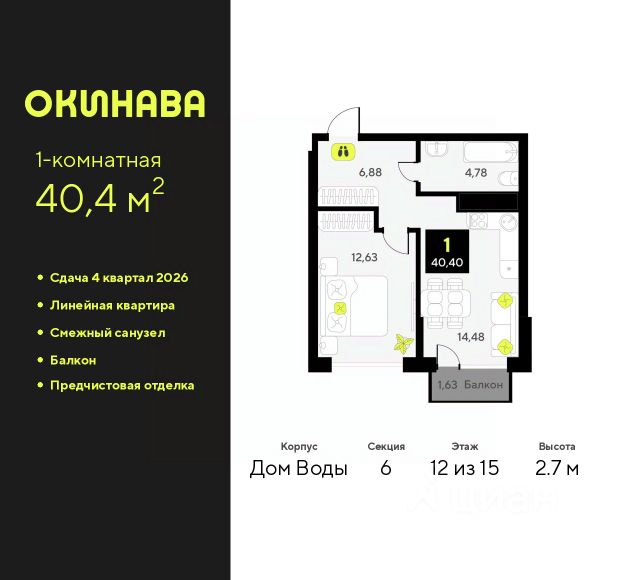 1-комн. квартира от застройщика с предчистовой отделкой в ЖК "Республики 205" на 12 этаже. Общая площадь: 46.65 кв.м., жилая: 10.8 кв.м., площадь просторной кухни-гостиной: 14.1 кв.м. Все окна выходят на одну сторону. В квартире одна лоджия, один совмещенный санузел. Высота потолков 2.7 м.