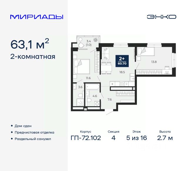 Продается 2-комн. квартира с предчистовой отделкой в ЖК "Мириады" на 5 этаже. Общая площадь: 63.1 кв.м. Высота потолков 2.7 м. Дом монолитный, многоподъездный, переменной этажности, от 14 до 16 этажей. Квартира находится в 4-й секции высотой 16 этажей в корпусе ГП-72.102. На этаже 6 квартир. В подъезде 1 пассажирский и 1 грузовой лифт. На сегодняшний день строительство завершено, дом сдан в 4 квартале 2025 года. Оформление сделки по договору купли-продажи. Вселенная бесконечных историй. Ранее невиданный Тюмени масштаб: территория 240 гектаров и 1 650 000 м² застройки. Мириады это город масштабных перемен и больших возможностей. Город зеленых рощ и зеркальных озер. Город для работы, учебы и развлечений. Город для детей и их родителей. Город для всех и каждого. Проект расположен в районе Мыс рядом с ТРЦ "Тюмень Сити Молл" в границах улицы Тимофея Чаркова, Тобольского тракта и объездной дороги. Срок полного освоения территории - до 2034 года. #z6E8FW