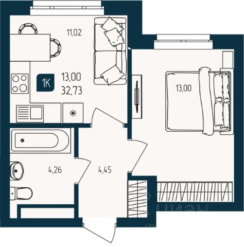 Продаётся 1-комнатная квартира в строящемся доме (Дом Семейный (ГП-3)), срок сдачи: III-кв. 2027, общей площадью 32.73 кв.м., на 7 этаже. Новый жилой комплекс "Квартал Мятный" от Специализированного застройщика "Юпитер" расположен по адресу: г. Тюмень по ул. Кулибина.