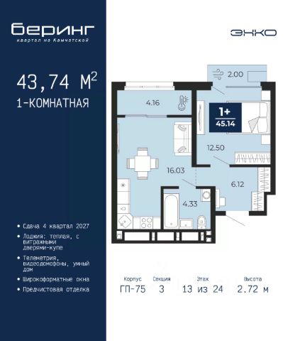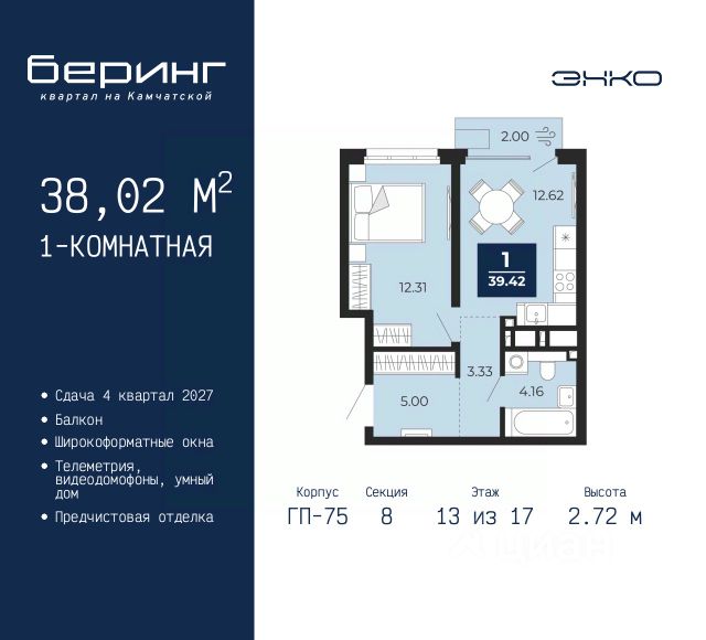 1-комн. квартира с предчистовой отделкой в ЖК "Беринг" на 13 этаже. Общая площадь: 41.03 кв.м., жилая: 14.72 кв.м., площадь просторной кухни-столовой: 16.59 кв.м. Все окна выходят на одну сторону. В квартире один балкон, один совмещенный санузел. Высота потолков 2.72 м. Дом монолитный, черырехподъездный, переменной этажности, от 19 до 24 этажей. Квартира находится во 2-й секции высотой 19 этажей в корпусе ГП-76. На этаже 8 квартир. В подъезде 1 пассажирский и 1 грузовой лифт. Окончание строительства - 4 квартал 2027 года. Оформление сделки по договору долевого участия. Подобно знаменитому исследователю, мы чувствуем себя первооткрывателями этой локации. Хотим показать новую суть места, сформировать для вас жизненный опыт, которого ещё не было. Беринг — район зелёного цвета. Беринг — район, который откроется вам с другой стороны. Впечатлит новым уровнем комфорта и качеством жизни. Беринг — открытие на карте города. Первый квартал расположен в районе Тура, в границах улиц: Камчатская Западносибирская Энтузиастов. Вокруг уже есть всё для того, чтобы ежедневная рутина была лишь частью жизни и не доставляла дискомфорта. Школы и детские сады, магазины и аптеки, поликлиника, места для семейного отдыха, пеших и велопрогулок, и даже рыбалки. Масштабное озеленение дворов — визитная карточка ЭНКО и ваш оазис спокойствия, чтобы отвлечься от повседневности. Раскидистые деревья, кустарники, травы и цветы — осталось остановиться, вдохнуть и расслабиться, глядя на эту природную красоту. Стилистика подъездов продолжает концепцию Беринга, вдохновлённого Камчаткой: сдержанный, но при этом впечатляющий дизайн соседствует с удобством и функциональностью. #zm6Ctm