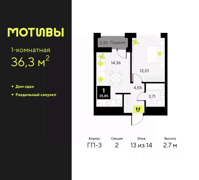 Продаётся квартира площадью 36.9 м2 в жилом комплексе "Айрис". Квартира находится на 13 этаже, жилая площадь квартиры 9.9 м2, площадь просторной кухни — 17.9 м2. Среди особенностей планировки — изолированные комнаты с окнами на одну сторону, 1 совмещённый санузел. Срок сдачи — III кв. 2027 "Айрис" — Смарт-квартал для активной и комфортной жизни "Айрис" расположен в новом экологически чистом районе Комарово Парк — локации без промышленного прошлого,в окружении трёх зелёных парков, до которых можно дойти за 10 минут. Здесь свежий воздух, природа и тишина сочетаются с городским комфортом. Рядом вся ключевая инфраструктура: ТРЦ "Колумб" и "Кристалл", Гимназия 4, Академия спорта, детские сады 60 и 95. Смарт-архитектура обеспечивает хорошие виды и естественное освещение. Разновысотная застройка формирует ощущение открытого пространства, а панорамные окна наполняют квартиры светом. Дворы без машин — безопасные игровые и спортивные зоны, зелёные пространства, места для отдыха и спорта. Большой выбор планировок — от студий до трёхкомнатных квартир, а также редкие форматы: террасы, зимние сады и сити-хаусы. Дополнительные удобства — кладовые на этажах, лаундж-парадные, два наземных паркинга. Продуманная транспортная доступность Благодаря продуманной транспортной доступности "Айрис" одинаково удобен и для автомобилистов, и для тех, кто пользуется общественным транспортом. Район остаётся тихим, при этом сохраняется связь с основными направлениями города: • 2025 минут до центра Тюмени • 67 минут до объездной дороги • 5 минут до Московского тракта Смарт-пространство для жизни без компромиссов "Айрис" предлагает продуманные пространства, которые поддерживают комфортный и активный образ жизни. На крышах паркингов размещены лайфстайл-зоны: площадки для тренировок, кинотеатр под открытым небом, зелёные террасы для йоги и отдыха — всё, что нужно для активной городской жизни рядом с домом. Максимум света и воздуха в каждой квартире Пространственные решения усиливают ощущение простора: • панорамные окна высотой 1,652,4 м; • витражные балконы и лоджии, расширяющие визуальные границы; • потолки от 2,72 м на типовых этажах до 4,62 м на первом. Многофункциональные крыши паркингов: новый уровень городской инфраструктуры Жители "Айрис" могут заниматься спортом, отдыхать и встречаться на свежем воздухе. — прямо на крышах паркингов. Здесь расположены: • воркаут-зона с тренажёрами и цифровыми программами тренировок — поддерживать форму можно рядом с домом; • кинотеатр под открытым небом, который летом становится центром вечерней жизни квартала; • зелёные террасы — тихие места для отдыха, чтения и встреч; • йога-терраса, где удобнее всего заниматься на рассвете и закате.