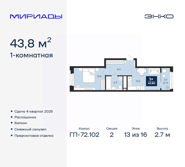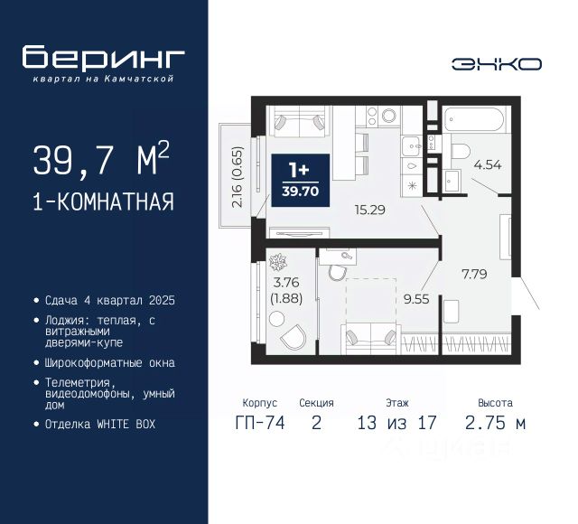 1-комн. квартира в ЖК "Беринг" на 13 этаже. Квартира без отделки, полностью готова к ремонту. Общая площадь: 42.19 кв.м., жилая: 13.09 кв.м., площадь просторной кухни-столовой: 15.92 кв.м. Все окна выходят на одну сторону. В квартире одна лоджия, один совмещенный санузел. Высота потолков 2.75 м. Дом монолитный, многоподъездный, переменной этажности, от 9 до 22 этажей. Квартира находится в 73.2-й секции высотой 22 этажа в корпусе ГП-73. На этаже 7 квартир. В подъезде 1 пассажирский и 1 грузовой лифт. Окончание строительства - 4 квартал 2025 года. Оформление сделки по договору долевого участия. Подобно знаменитому исследователю, мы чувствуем себя первооткрывателями этой локации. Хотим показать новую суть места, сформировать для вас жизненный опыт, которого ещё не было. Беринг — район зелёного цвета. Беринг — район, который откроется вам с другой стороны. Впечатлит новым уровнем комфорта и качеством жизни. Беринг — открытие на карте города. Первый квартал расположен в районе Тура, в границах улиц: Камчатская Западносибирская Энтузиастов. Вокруг уже есть всё для того, чтобы ежедневная рутина была лишь частью жизни и не доставляла дискомфорта. Школы и детские сады, магазины и аптеки, поликлиника, места для семейного отдыха, пеших и велопрогулок, и даже рыбалки. Масштабное озеленение дворов — визитная карточка ЭНКО и ваш оазис спокойствия, чтобы отвлечься от повседневности. Раскидистые деревья, кустарники, травы и цветы — осталось остановиться, вдохнуть и расслабиться, глядя на эту природную красоту. Стилистика подъездов продолжает концепцию Беринга, вдохновлённого Камчаткой: сдержанный, но при этом впечатляющий дизайн соседствует с удобством и функциональностью. #zsEMFO