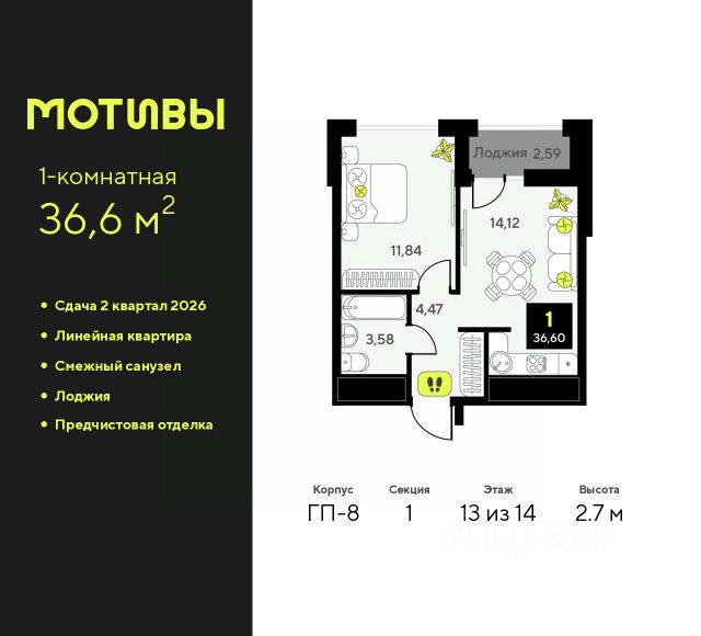 Однокомнатная квартира с предчистовой отделкой в ЖК "Мотивы" на 13 этаже. Общая площадь: 36.6 кв.м., жилая: 11.84 кв.м., площадь просторной кухни-столовой: 14.12 кв.м. Все окна выходят на одну сторону. В квартире одна лоджия, один совмещенный санузел. Высота потолков 2.7 м. Квартира будет сдаваться с предчистовой отделкой White Box: выровнены и оштукатурены стены, проведено электричество и отопление, установлены радиаторы. Вы также можете приобрести квартиру с ремонтом от застройщика, представленным в трех цветовых решениях Scandi, Wood и Coffee и включающим ламинат, обои под покраску, двери, натяжной потолок и санузел с сантехникой. При желании вы можете заказать отделку под ключ, варианты возможных решений представлены в альбоме фотографий. Дом монолитный, черырехподъездный, переменной этажности, от 12 до 14 этажей. Квартира находится в 1-й секции высотой 14 этажей в корпусе ГП-8. На этаже 12 квартир. В подъезде 1 пассажирский и 1 грузовой лифт. Окончание строительства - 2 квартал 2026 года. Оформление сделки по договору долевого участия. Закрытая от автомобилей территория, безопасный двор и камеры видеонаблюдения - гаранты вашего спокойствия. Квартал будет располагать богатой инфраструктурой: на первых этажах разместятся магазины, пекарни, кофейни, пункты выдачи, аптеки, детские центры, цветочные салоны и многое другое, что сделает жизнь поистине комфортной. Рядом находится парк общей площадью почти 5000 м², в котором располагаются локации для игр и отдыха жителей, здесь можно совершить утреннюю пробежку или прогуляться после рабочего дня. В парке есть зона воркаута с тренажерами для взрослых, игровые комплексы с горками и канатный комплекс для детей разных возрастов, качели и лавочки для отдыха, площадки для командных видов спорта и для панна-футбола. В ЖК "Мотивы" всё продумано до мелочей: светлые холлы входных групп, оформленные в едином стиле, просторные колясочные, лапомойки для питомцев. На территории комплекса находятся 2 8-ми этажных паркинга и более 1000 м/м на открытой парковке. Жилой комплекс находится в одном из экологически благоприятных районов Тюмени, недалеко от Плехановского бора. При этом до центра города можно добраться за 15 минут, а до международного аэропорта Рощино за 13 минут. Окончание строительства: ГП 1, 2, 3, 4 сдача до конца 2024 года, ГП 6, 7, 8 сдача 2 квартал 2026 года. #24A7Cf Продается 1-комнатная квартира на 13 этаже в Тюмени.