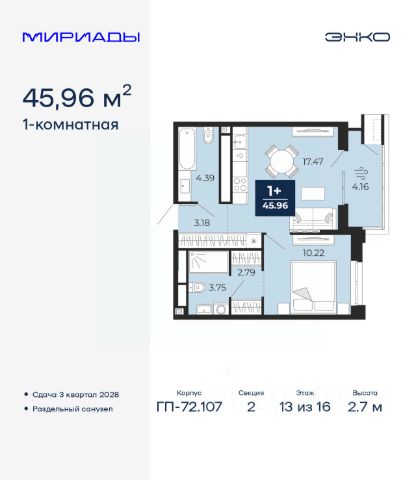 Продается однокомнатная квартира с предчистовой отделкой в ЖК "Прео" на 13 этаже. Общая площадь: 43.08 кв.м., жилая: 14 кв.м., площадь просторной кухни-столовой: 15.98 кв.м. Все окна выходят на одну сторону. В квартире один совмещенный санузел. Высота потолков 2.7 м.