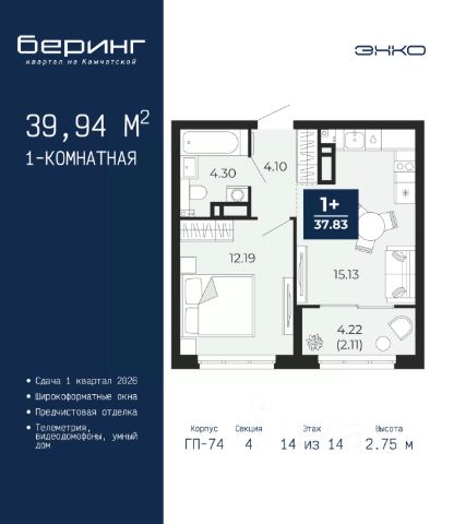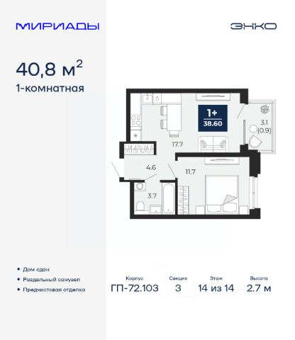 Однокомнатная квартира от застройщика с предчистовой отделкой в ЖК "Мириады" на 14 этаже. Общая площадь: 40.8 кв.м. Высота потолков 2.7 м. Дом монолитный, трехподъездный, переменной этажности, от 14 до 16 этажей. Квартира находится в 3-й секции высотой 14 этажей в корпусе ГП-72.103. На этаже 8 квартир. В подъезде 1 пассажирский и 1 грузовой лифт. На сегодняшний день строительство завершено, дом сдан в 4 квартале 2025 года. Оформление сделки по договору купли-продажи. Вселенная бесконечных историй. Ранее невиданный Тюмени масштаб: территория 240 гектаров и 1 650 000 м² застройки. Мириады это город масштабных перемен и больших возможностей. Город зеленых рощ и зеркальных озер. Город для работы, учебы и развлечений. Город для детей и их родителей. Город для всех и каждого. Проект расположен в районе Мыс рядом с ТРЦ "Тюмень Сити Молл" в границах улицы Тимофея Чаркова, Тобольского тракта и объездной дороги. Срок полного освоения территории - до 2034 года. #26DF2M