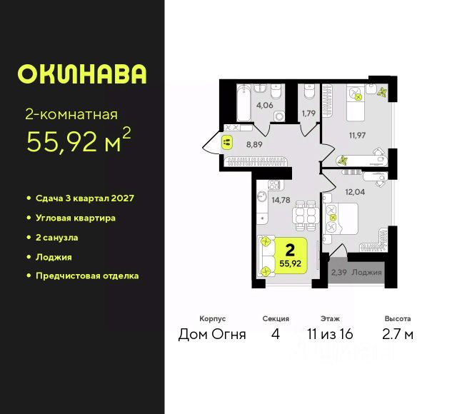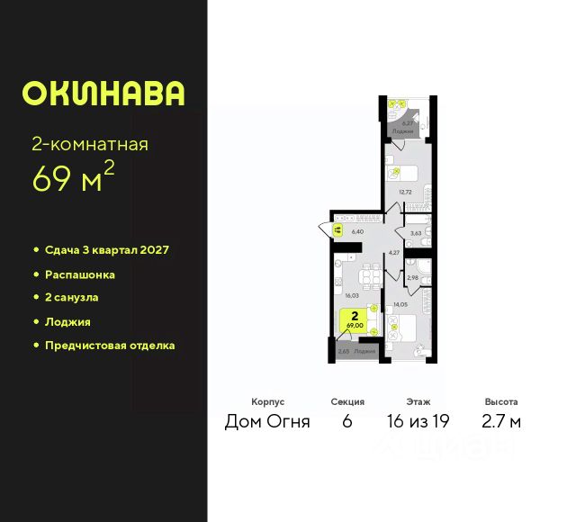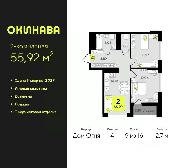 Дом монолитный, многоподъездный, переменной этажности, от 13 до 19 этажей. Квартира находится в 4-й секции высотой 16 этажей в корпусе Дом Огня. На этаже 6 квартир. В подъезде 1 пассажирский и 1 грузовой лифт. Окончание строительства - 3 квартал 2027 года. Оформление сделки по договору долевого участия.