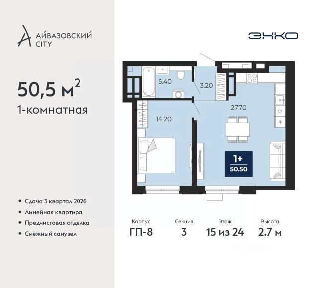 Продается 1-комн. квартира с предчистовой отделкой в ЖК "Айвазовский City" на 15 этаже. Общая площадь: 50.5 кв.м., жилая: 14.2 кв.м., площадь просторной кухни-столовой: 27.7 кв.м. Все окна выходят на одну сторону. В квартире один совмещенный санузел. Высота потолков 2.7 м. Дом монолитный, многоподъездный, переменной этажности, от 14 до 24 этажей. Квартира находится в 3-й секции высотой 24 этажа в корпусе ГП-8. На этаже 7 квартир. В подъезде 1 пассажирский и 1 грузовой лифт. Окончание строительства - 3 квартал 2026 года. Оформление сделки по договору долевого участия. Новый жилой район располагается в живописном месте на берегу Туры в центральной части города. Принципиально новое пространство для жизни в центре современного города для тех, чьи мечты сбываются, кто нацелен на постоянный рост, перемены к лучшему для себя и своих близких. Каждая деталь Айвазовский City вдохновляет и заряжает на новые свершения: авторская архитектура, сбалансированная продуманная инфраструктура, дизайнерские дворы со спортивными и детскими площадками, парковые зоны с фонтанами, водный канал, украшающий центральный прогулочный маршрут района и многое другое. В 2019 года проект стал лауреатом престижной премии Urban Awards 2019 в номинации "Лучший строящийся региональный жилой комплекс бизнес-класса". Главная особенность Айвазовский City - соседство разных архитектурных школ в рамках одного дома. Изысканная классика, выразительная эклектика и оригинальный модерн - жить в одном из таких домов настоящий повод для гордости. Айвазовский City это идеальное сочетание комфорта, технологий и развитой инфраструктуры. Вход в подъезд возможен с улицы и со двора. Отправляясь на работу или за покупками, жители могут выйти с внешней стороны дома, а для прогулки с ребенком со стороны двора. Экологически чистые материалы и энергосберегающие технологии, качественное освещение общественных зон, видеонаблюдение по всей территории жилого района (в том числе в подъездах, лифтах и в подземном паркинге), закрытые дворы с доступом только для жителей Айвазовский City. Часть домов в Айвазовский City будут оснащены подземным паркингом. Востребованный в нашем климатическом поясе формат хранения автомобилей защитит собственность владельца в любое время года. Аккредитация в банках: ПАО Банк "ВТБ", ПАО "Газпромбанк", "Сбербанк России", ОАО "Альфа-Банк", ПАО "Промсвязьбанк" и других. #Zm2A56