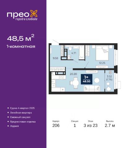 1-комн. квартира от застройщика с предчистовой отделкой в ЖК "Прео" на 7 этаже. Общая площадь: 39.16 кв.м., жилая: 11.57 кв.м., площадь просторной кухни-столовой: 18.89 кв.м. Все окна выходят на одну сторону. В квартире один балкон, один совмещенный санузел. Высота потолков 2.7 м.