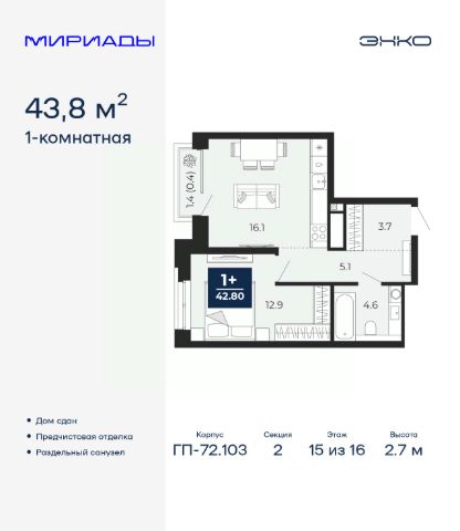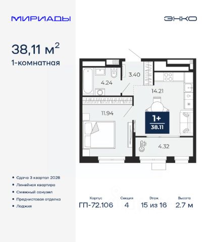 Дом монолитный, многоподъездный, переменной этажности, от 7 до 16 этажей. Квартира находится в 1-й секции высотой 16 этажей в корпусе 1. На этаже 8 квартир. В подъезде 2 пассажирских лифта. Окончание строительства - 4 квартал 2026 года. Оформление сделки по договору долевого участия.