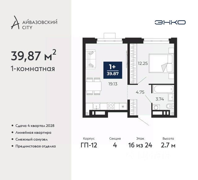 1-комн. квартира с предчистовой отделкой в ЖК "Айвазовский City" на 16 этаже. Общая площадь: 52.54 кв.м., жилая: 13.4 кв.м., площадь просторной кухни-столовой: 21.29 кв.м. Все окна выходят на одну сторону. В квартире одна лоджия, один совмещенный санузел. Высота потолков 2.7 м. Дом монолитный, многоподъездный, высотой 24 этажа. Квартира находится в 4-й секции в корпусе ГП-12. На этаже 5 квартир. В подъезде 1 пассажирский и 1 грузовой лифт. Окончание строительства - 4 квартал 2028 года. Оформление сделки по договору долевого участия. Новый жилой район располагается в живописном месте на берегу Туры в центральной части города. Принципиально новое пространство для жизни в центре современного города для тех, чьи мечты сбываются, кто нацелен на постоянный рост, перемены к лучшему для себя и своих близких. Каждая деталь Айвазовский City вдохновляет и заряжает на новые свершения: авторская архитектура, сбалансированная продуманная инфраструктура, дизайнерские дворы со спортивными и детскими площадками, парковые зоны с фонтанами, водный канал, украшающий центральный прогулочный маршрут района и многое другое. В 2019 года проект стал лауреатом престижной премии Urban Awards 2019 в номинации "Лучший строящийся региональный жилой комплекс бизнес-класса". Главная особенность Айвазовский City - соседство разных архитектурных школ в рамках одного дома. Изысканная классика, выразительная эклектика и оригинальный модерн - жить в одном из таких домов настоящий повод для гордости. Айвазовский City это идеальное сочетание комфорта, технологий и развитой инфраструктуры. Вход в подъезд возможен с улицы и со двора. Отправляясь на работу или за покупками, жители могут выйти с внешней стороны дома, а для прогулки с ребенком со стороны двора. Экологически чистые материалы и энергосберегающие технологии, качественное освещение общественных зон, видеонаблюдение по всей территории жилого района (в том числе в подъездах, лифтах и в подземном паркинге), закрытые дворы с доступом только для жителей Айвазовский City. Часть домов в Айвазовский City будут оснащены подземным паркингом. Востребованный в нашем климатическом поясе формат хранения автомобилей защитит собственность владельца в любое время года. Аккредитация в банках: "Сбербанк России", ПАО "Газпромбанк", ПАО Банк "ВТБ", ОАО "Альфа-Банк", АО "ДОМ.РФ" и других. #26vge3