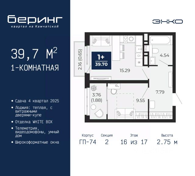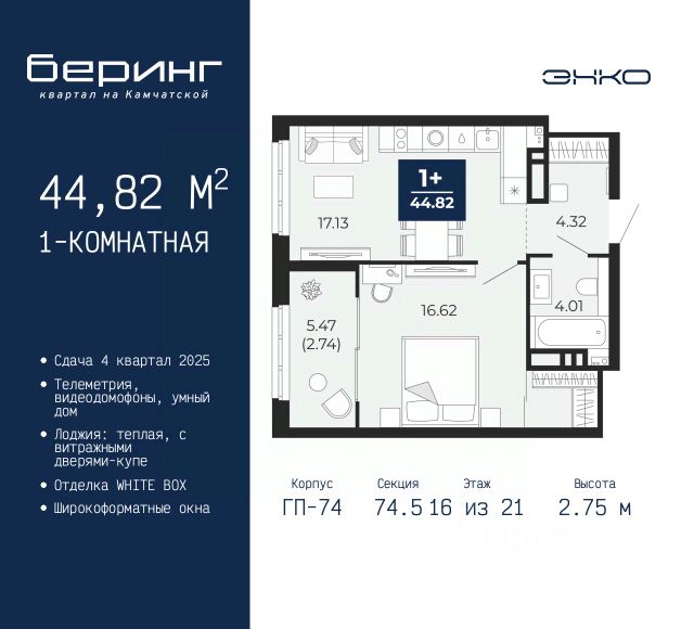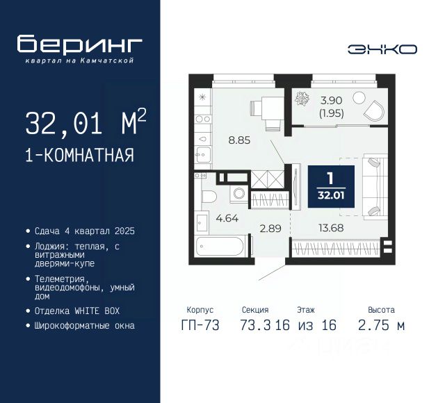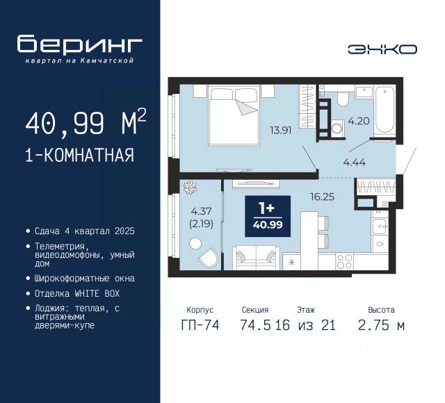 1-комн. квартира в ЖК "Беринг" на 16 этаже. Квартира без отделки, новый владелец может сделать ремонт по индивидуальному дизайн-проекту. Общая площадь: 37.24 кв.м., жилая: 10.59 кв.м., площадь просторной кухни-столовой: 14.18 кв.м. Все окна выходят на одну сторону. В квартире один балкон и одна лоджия, один совмещенный санузел. Высота потолков 2.75 м. Дом монолитный, многоподъездный, переменной этажности, от 9 до 21 этажей. Квартира находится во 2-й секции высотой 17 этажей в корпусе ГП-74. На этаже 7 квартир. В подъезде 1 пассажирский и 1 грузовой лифт. Окончание строительства - 4 квартал 2025 года. Оформление сделки по договору долевого участия. Подобно знаменитому исследователю, мы чувствуем себя первооткрывателями этой локации. Хотим показать новую суть места, сформировать для вас жизненный опыт, которого ещё не было. Беринг — район зелёного цвета. Беринг — район, который откроется вам с другой стороны. Впечатлит новым уровнем комфорта и качеством жизни. Беринг — открытие на карте города. Первый квартал расположен в районе Тура, в границах улиц: Камчатская Западносибирская Энтузиастов. Вокруг уже есть всё для того, чтобы ежедневная рутина была лишь частью жизни и не доставляла дискомфорта. Школы и детские сады, магазины и аптеки, поликлиника, места для семейного отдыха, пеших и велопрогулок, и даже рыбалки. Масштабное озеленение дворов — визитная карточка ЭНКО и ваш оазис спокойствия, чтобы отвлечься от повседневности. Раскидистые деревья, кустарники, травы и цветы — осталось остановиться, вдохнуть и расслабиться, глядя на эту природную красоту. Стилистика подъездов продолжает концепцию Беринга, вдохновлённого Камчаткой: сдержанный, но при этом впечатляющий дизайн соседствует с удобством и функциональностью. #zuS5WB